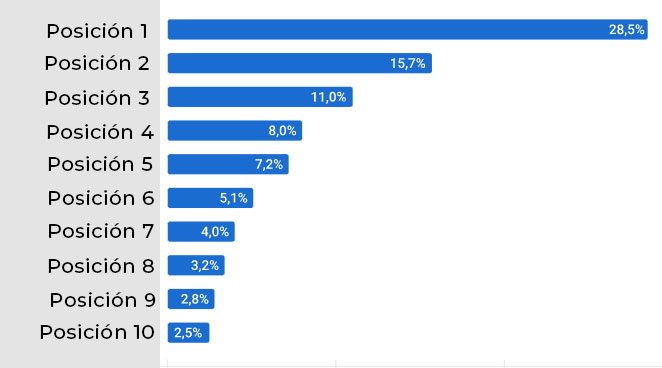 Cuanto más arriba figures en los resultados de búsqueda más visitas recibirás y más posibilidades de hacer negocio. Mira en esta tabla el tanto por cien de clicks según en la posición que aparezcas en Google.
