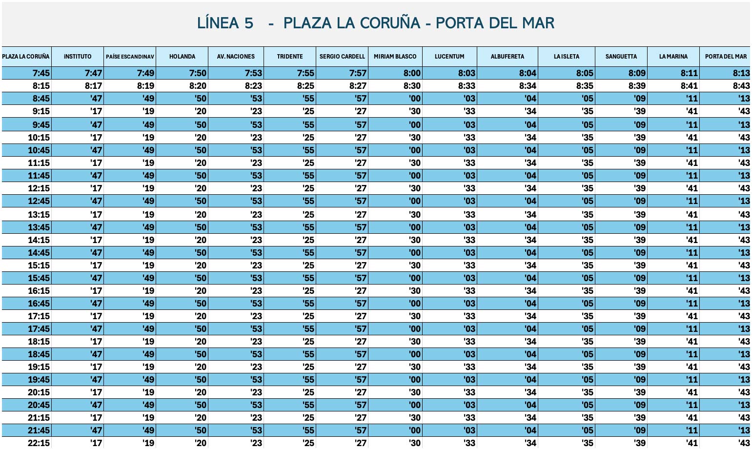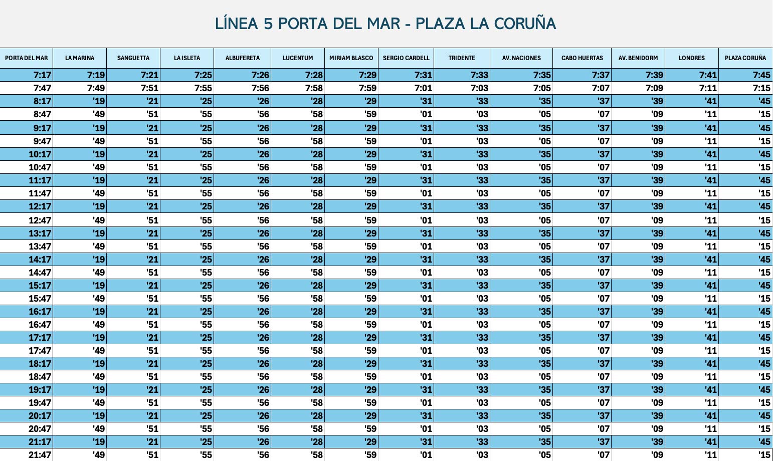 Aquí tienes la tabla de horarios con las horas de paso por todas las paradas de la línea 5, tanto dirección Playa San Juan como dirección Alicante. Puedes pinchar para hacer la tabla más grande